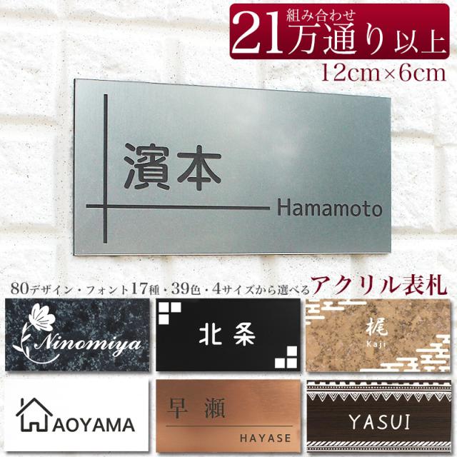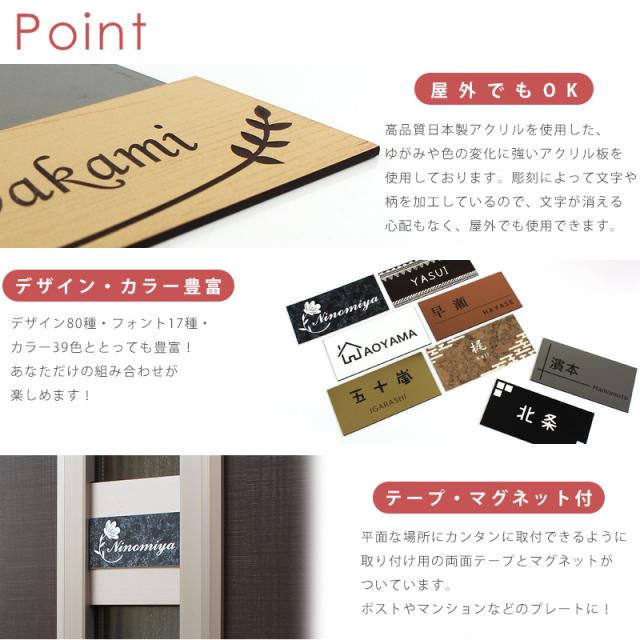 | 商品説明 | ご自宅のポストやドア、マンションのネームプレートに!アクリル表札です。 高品質日本製アクリルを使用した、ゆがみや色の変色に強いアクリル板を使用しております。 彫刻なので、文字がはがれる心配もなく、屋外でもご使用頂けます。 デザイン80種、フォント17種類、カラー39色と豊富で組み合わせはお客様次第!! (動物デザインやかわいい系のデザインは別ページにて販売してます。) ポストやネームプレートなど平面な場所にカンタンに取り付け出来るように両面テープ・マグネット両方付属しています。 |