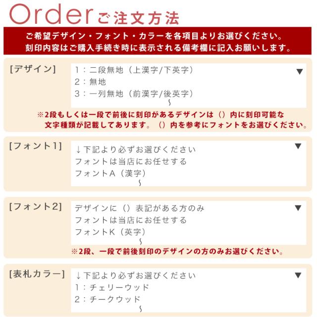 ※刻印の段数や表記方法はデザインによって異なります。名前の表記が2段のもの、もしくは一段で前後があるデザインは「フォント2」からフォントをお選びください。※
