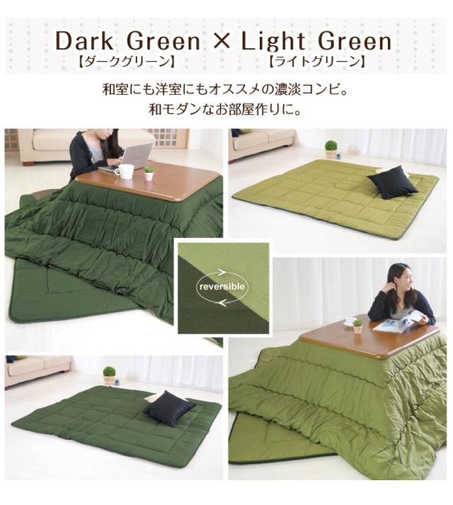 1、14カラー7バリエーションで色の組み合わせは196通り! 2、リバーシブルで経済的! カラーは両面違うので気分や季節によって変化を楽しめます! 3、掛・敷単品販売を実現! 4、生地の染めから縫製までとことんこだわった当店オリジナルこたつ布団! 5、安心・安全の国内生産! 6、正方形から超特大サイズまでフルサイズラインナップ! 7、同素材のこたつ布団カバーやマルチカバー、座布団カバーとの 組み合わせで、汚れ防止&トータルコーディネートも! |