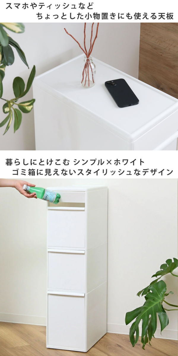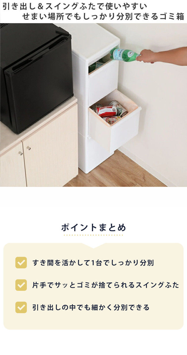 冷蔵庫や食器棚の横にあるちょっとした隙間にも収まるスリムなゴミ箱です。縦型のゴミ箱なので、キッチンのデッドスペースを有効活用して、1台でしっかり分別ができます。