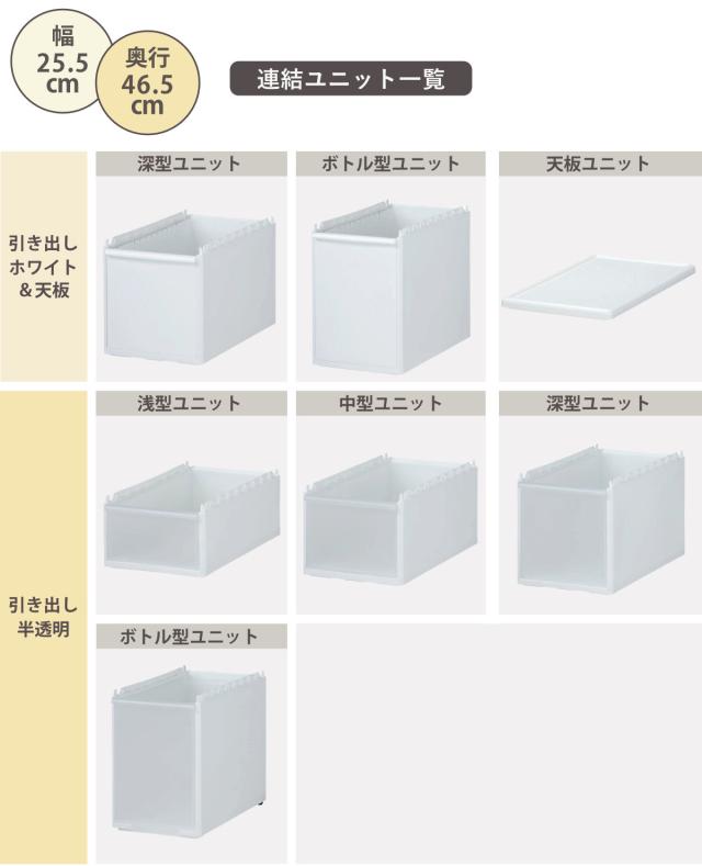 追加で段数を増やしたい方は、連結ユニットを組み合わせて、自由にカスタマイズができます。引き出しの色はホワイトと半透明、高さは4種類の中からお選びいただけます。
