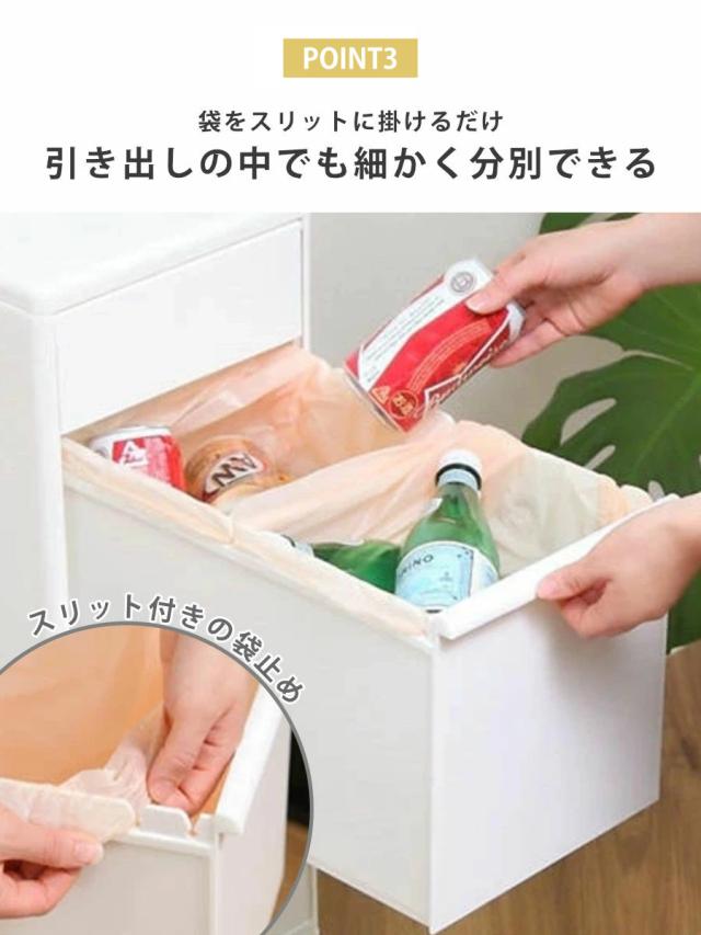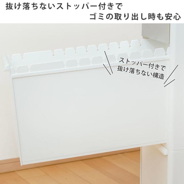 抜け落ちないストッパー付きの引き出しです。ゴミを取り出す時、うっかり勢いよく開けてしまっても、引き出しが抜けないので安心です。捨てる頻度が高いゴミは手前に、あまり出ないゴミは奥側に捨てることができます。