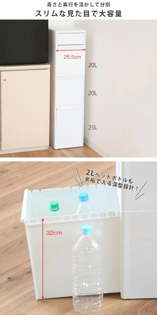 幅25.5cmとスリムな見た目ながら、しっかりゴミをストックできる大容量の65Lのゴミ箱です。上段の容量は20L、下段は25Lです。下段は高さ約32cmの深型で、2Lのペットボトルも立てて入れることができます。奥行もあるため、たくさんのゴミが捨てられます。