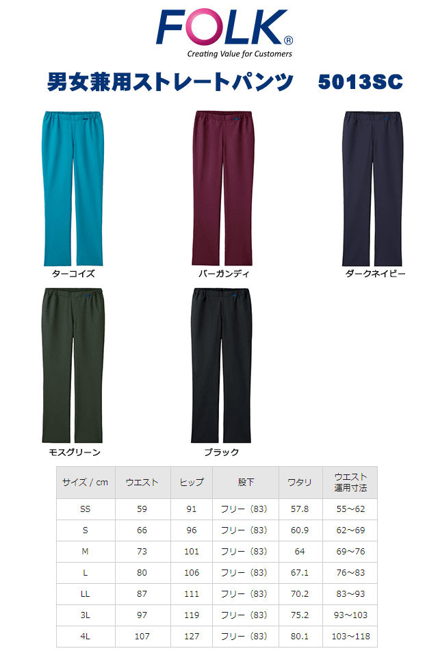 フォーク 男女兼用ストレートパンツ(総ゴム) 5013SC バーガンディ【男女兼用パンツ】