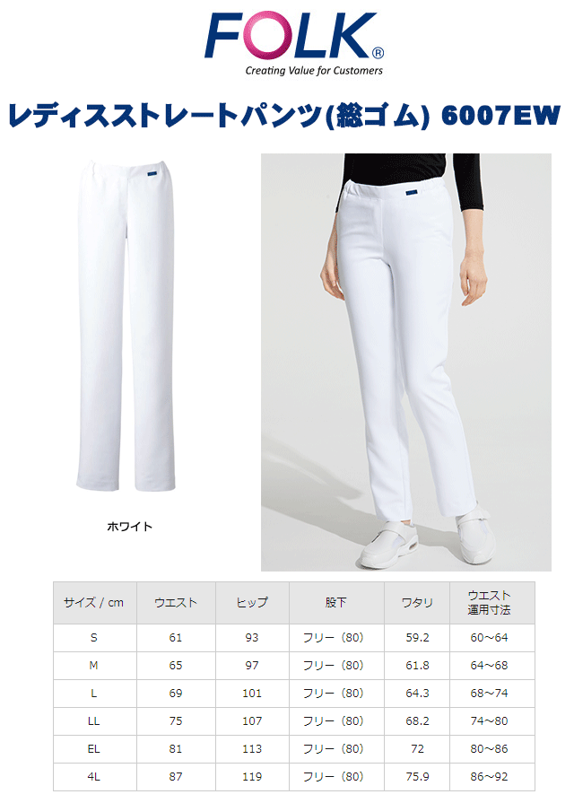 フォーク レディスストレートパンツ(総ゴム) 6007EW ホワイト【レディースパンツ】