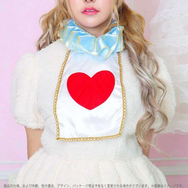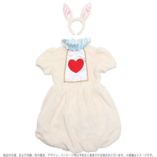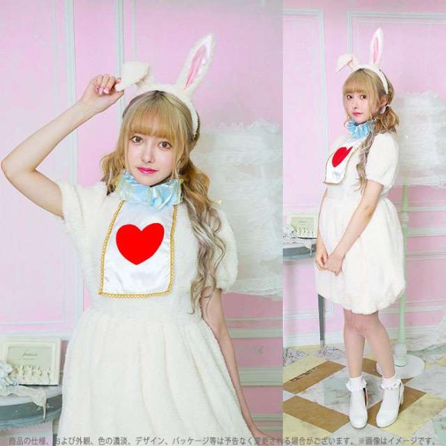 ふわもこアニマル ホワイトラビット。可愛くてあたたかいコスチューム、ふわもこアニマルシリーズ。ワンピースはもこもこしたファー素材。水色のボリュームのある襟と、胸元のハートがポイント。うさ耳はワイヤー入りで曲げられます。いろいろな動物でペアコーデやグループコーデ、テーマパークでのハロウィンにもおすすめ。