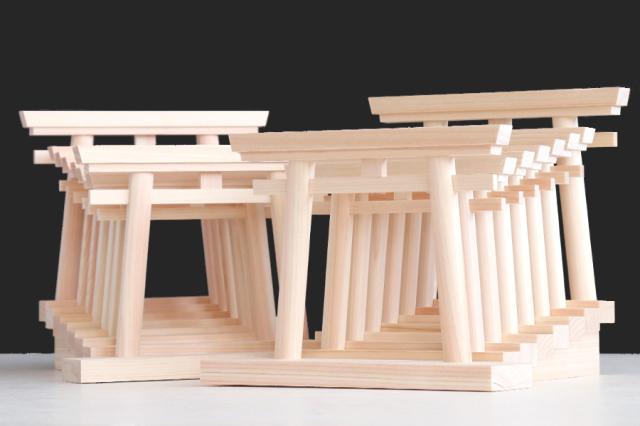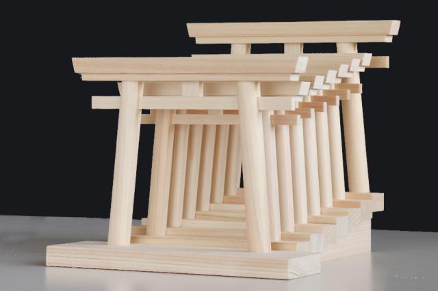奥へ進むほど昇りあがる鳥居と石畳は、運気上昇の願いを込めて。岐阜県・東濃地方で産出される上質な桧材。それを使い、山間の工房でゆっくり組み立てられたこの縁起物は、置いただけでも清楚なインテリアに。