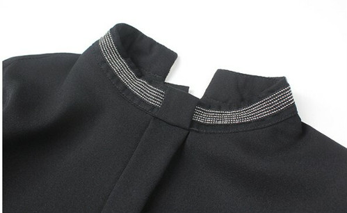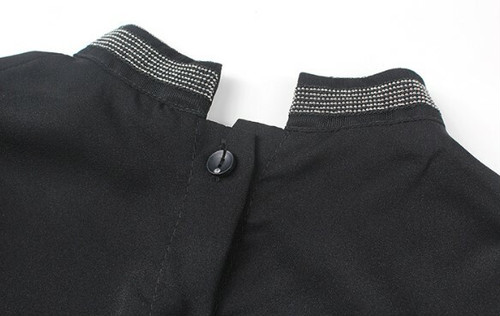 シンプルなデザインながらも首元、肩から袖口までのキラキラと目を惹くラインに大胆なスリットや