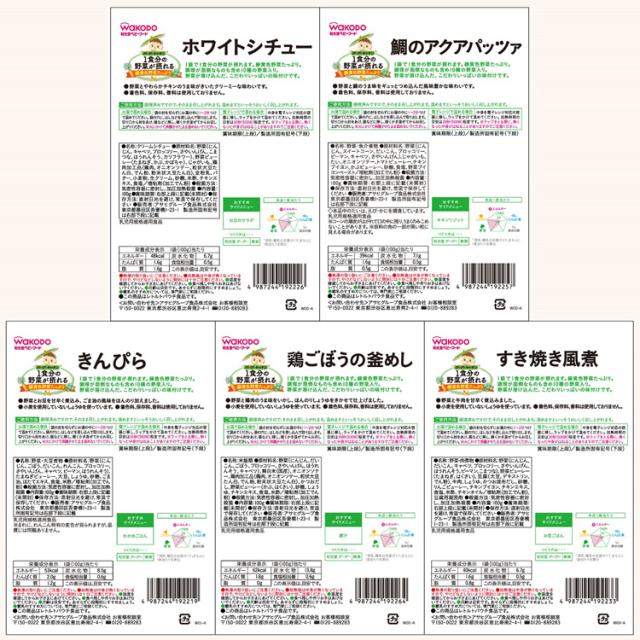 | ★ホワイトシチュー 野菜(にんじん、キャベツ、ブロッコリー、さやいんげん、こまつな、ほうれんそう、カリフラワー)、野菜ピューレー(たまねぎ、かぶ、かぼちゃ)、じゃがいも、鶏肉加工品(鶏肉、オニオンソテー。粒状大豆たん白、でん粉、粉末状大豆たん)、全粉乳、バター小麦粉、生クリーム、砂糖、米酢、チキンエキス、食塩/増粘剤(加圧でん粉) ★鯛のアクアパッツア 野菜(にんじん、スイートコーン、だいこん、ブロッコリー、ピーマン、キャベツ、さやいんげん)、じゃがいも、たい、オニオンソテー、トマトピューレー、チキンブイヨン、かぶピューレー、砂糖、食塩、野菜ブイヨンペースト/増粘剤(加圧でん粉) ★きんぴら 野菜(にんじん、ごぼう、だいこん、れんこん、ブロッコリー、さやいんげん、キャベツ、ピーマン、ほうれんそう)、たまねぎピューレー、だいず、しょうゆ、砂糖、ごま油、ほたてエキス、食塩、米酢/増粘剤(加圧でん粉) ★鶏ごぼうの釜めし 野菜(にんじん、だいこん、ごぼう、ブロッコリー、さやいんげん、ほうれんそう、キャベツ)、精白米(国産)、オニオンソテー、鶏肉加工品(鶏肉、オニオンソテー、粒状大豆たん白、でん粉、粉末状大豆たん白)、かつおだし、野菜ピューレー(かぶ、はくさい)、砂糖、しょうゆ、チキンエキス、食塩、米酢/増粘剤(加圧でん粉) ★すき焼き風煮 野菜(にんじん、だいこん、キャベツ、ブロッコリー、さやいんげん、キャベツ、ほうれんそう、ピーマン、こまつな)、野菜ピューレー(たまねぎ、はくさい)、豆腐(だいず、デキストリン、でん粉)、牛肉、しょうゆ、かつお昆布だし、砂糖、リンゴピューレー、チキンブイヨン、チキンエキス、食塩、米酢、チキンオイル/増粘剤(加圧でん粉)、豆腐用凝固剤 |