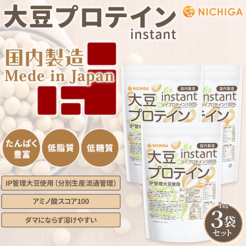 【送料無料!(北海道・九州・沖縄を除く)】 大豆プロテイン instant(国内製造) 1kg×3袋 IP管理大豆使用 ソイプロテイン100% 甘味料無添加 NICHIGA(ニチガ) TKS