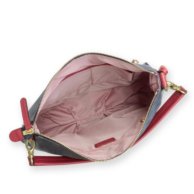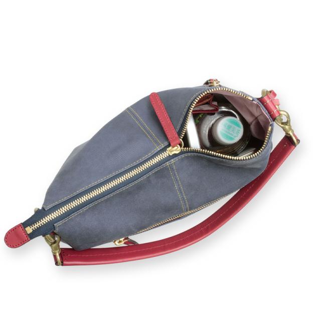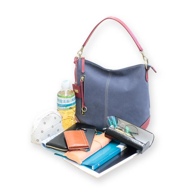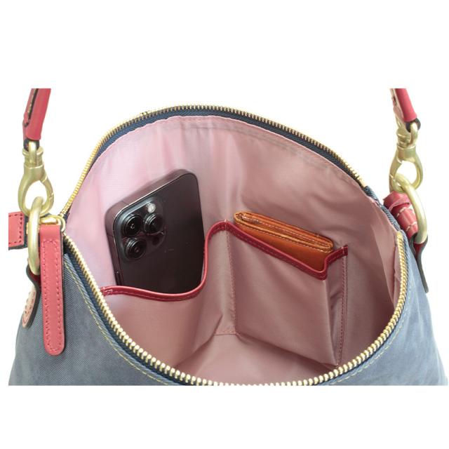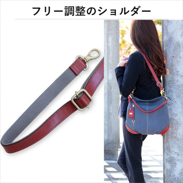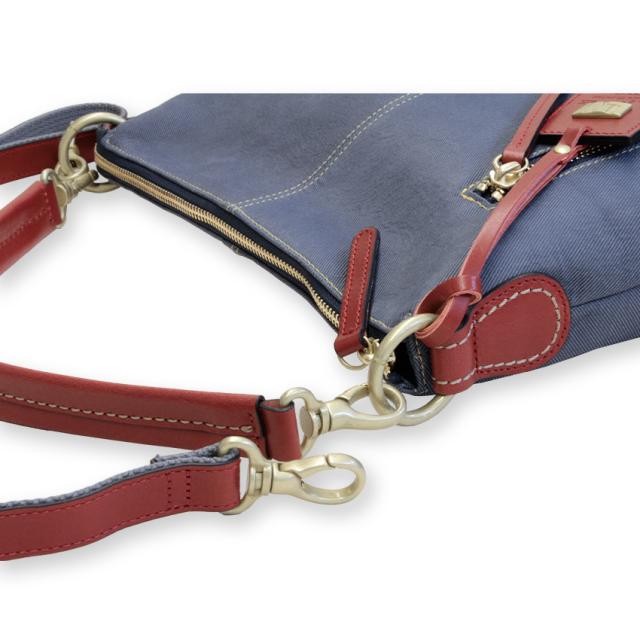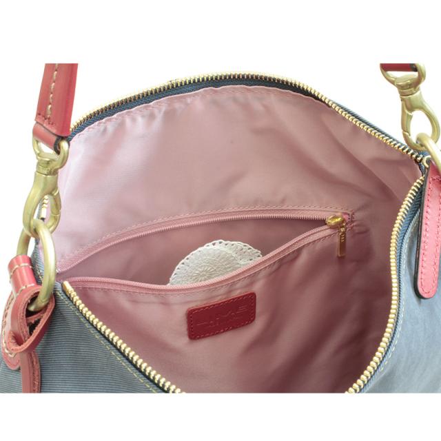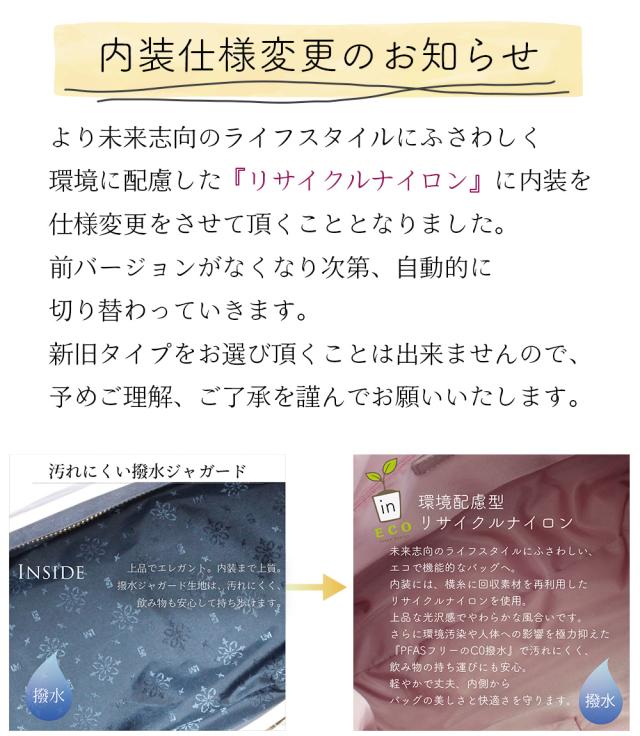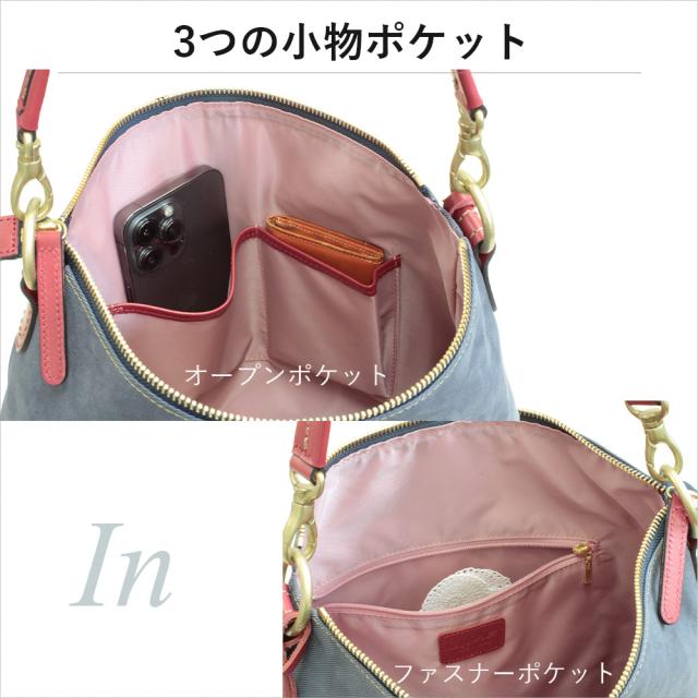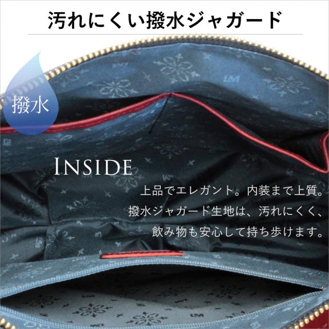 | 素材 | 牛革(デニム型押し) 内部素材(カラー) アイボリー:撥水ジャガード(ブルー) レッド:撥水ジャガード(ラベンダー) ネイビー:撥水リサイクルナイロン(ピンク) ショルダー:牛革×裏:コットン |