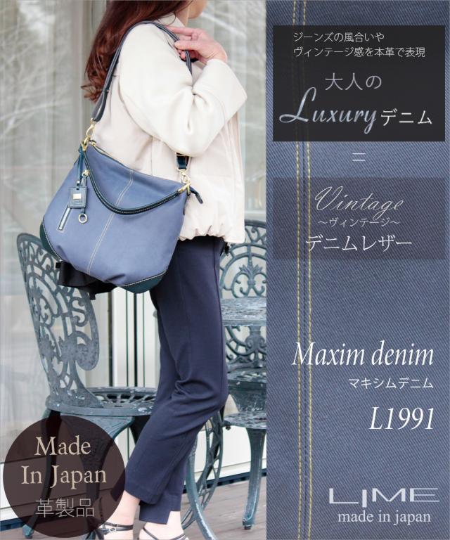 ショルダーバッグ レディース 本革 ハンドバッグ 軽量 軽い 日本製 革 牛革 デニム レザー バッグ ブランド ショルダー 斜めがけ 斜め掛け ななめ掛け 旅行 2way 2ウェイ マキシムデニム LIME ライム L1991 おしゃれ 大人 女性 機能的 ブランド 母の日 ギフト クリスマス