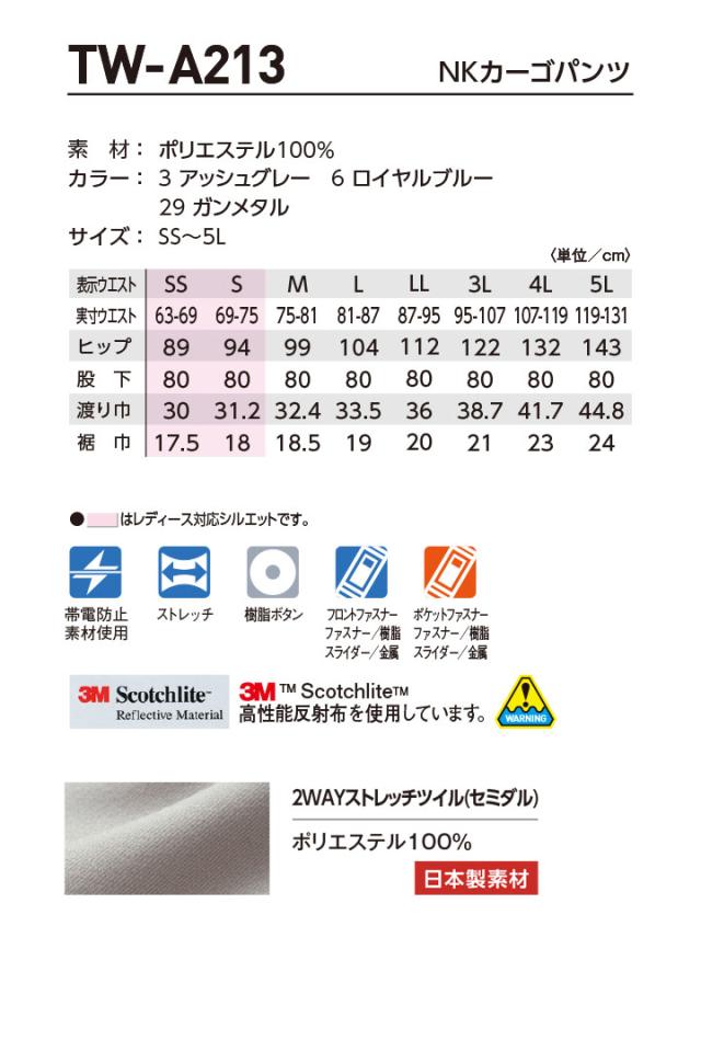 ズボン NKカーゴパンツ TW-A213 タカヤ商事 帯電防止 ストレッチ 日本製素材 反射 脇ゴム メンズ レディース ズボン タカヤワークウェア 作業着 作業服 4L 5L