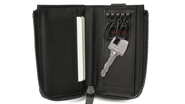 本体はL字ファスナー開閉でフルオープンになり、使い勝手の良さは抜群。内装には4連のキーフックを備えており、複数の鍵をまとめて管理可能です。また、ポケットが2ヶ設けられていますので、ICカードなども一緒に持ち歩くことができ便利です。