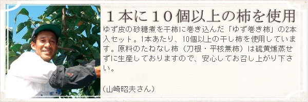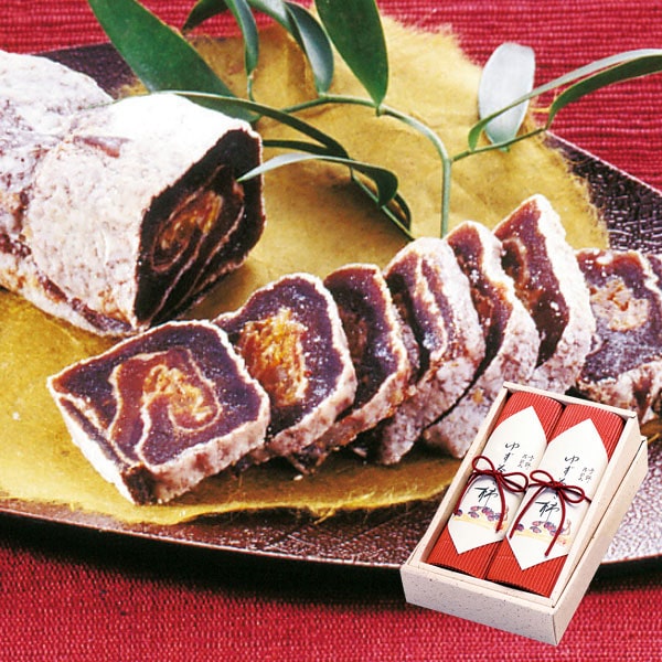 ゆず皮の砂糖煮を干柿に巻き込んだ「ゆず巻き柿」の2本入セット。