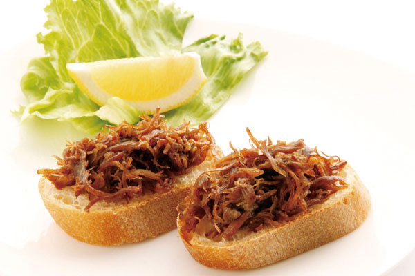 牛肉を塩(伯方の塩)・喜界島粗糖で2晩以上漬け込んだ肉を蒸煮してから手作業で丁寧に繊維までほぐして作られています。