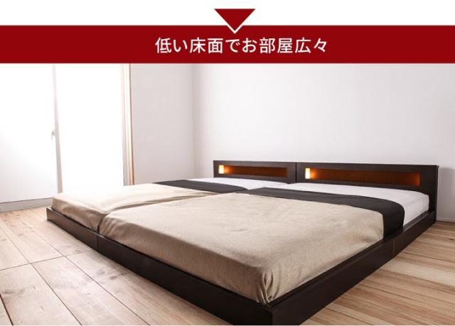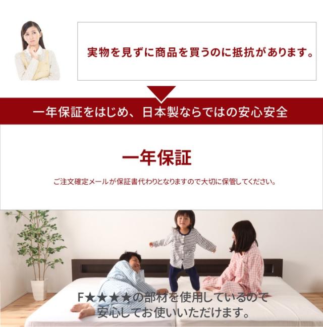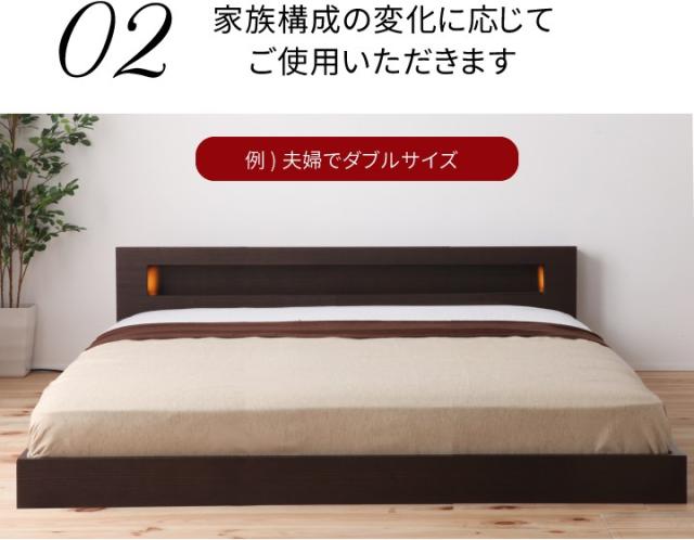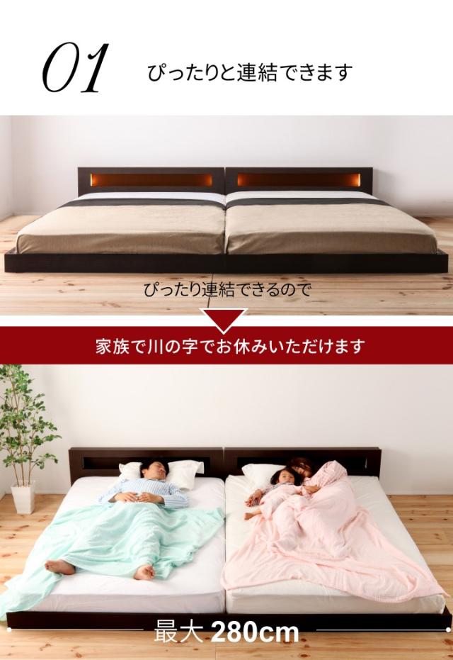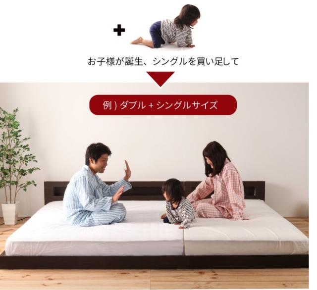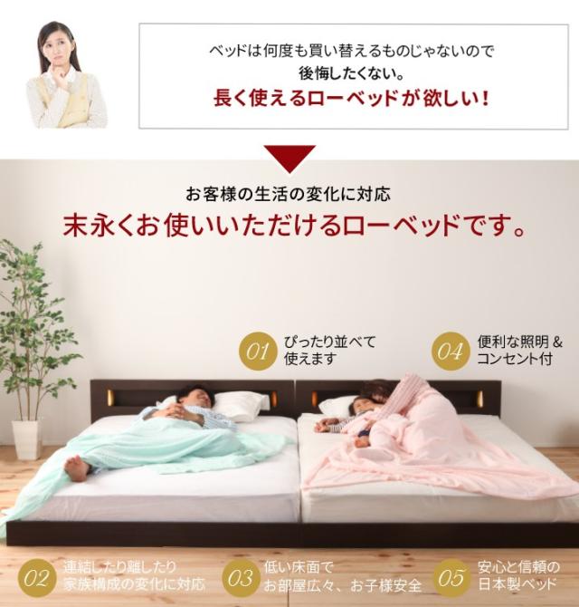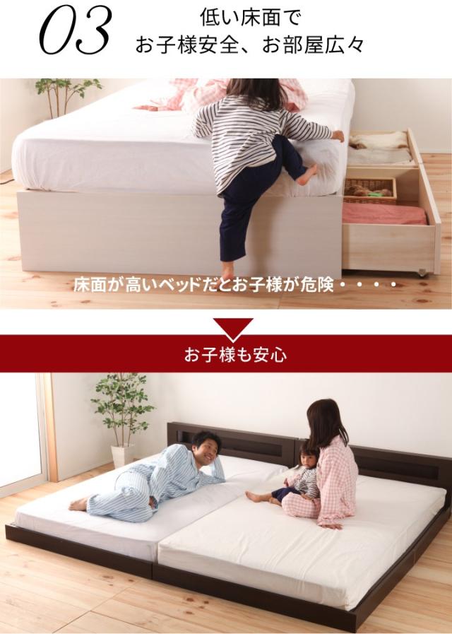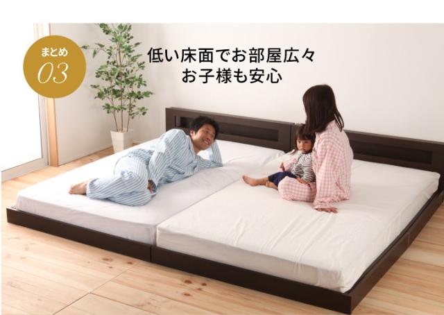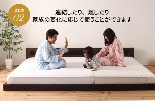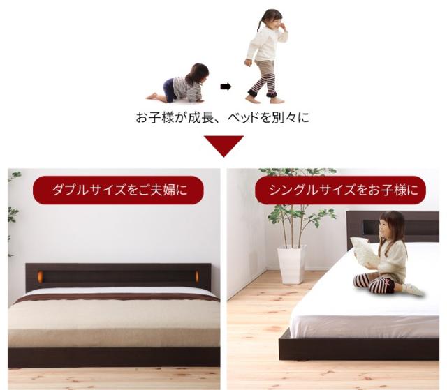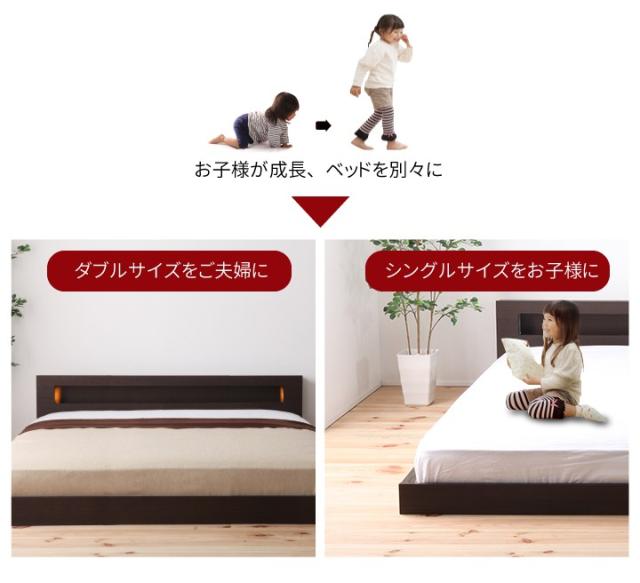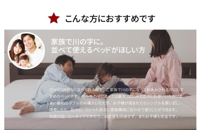 ・連結でき家族川の字でお休みされる方にぴったりです ・最初は夫婦でダブルを購入。お子様が誕生ののちシングルを買い足しして連結。お子様が成長したら、それぞれのベッドでといった具合に家族の変化に合わせた使い方が可能です。 ・低い床面でお子様も安心 ・F★★★★フレームの安全性 ・コンセント付 ・寝室をほのかに照らす照明付