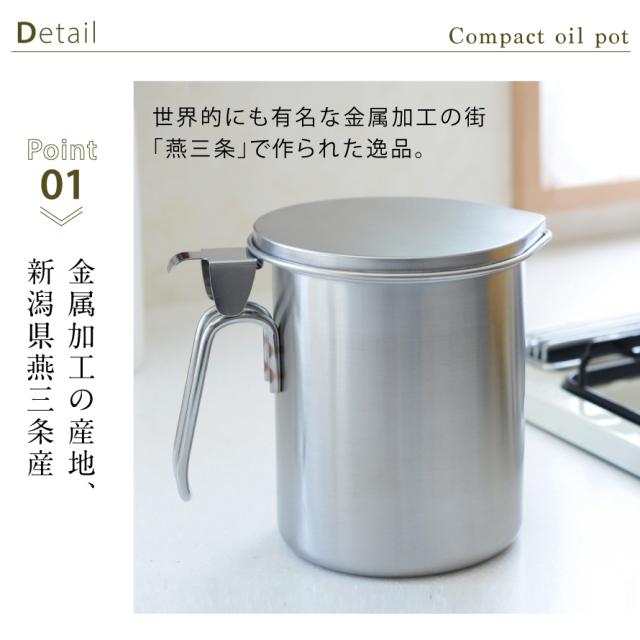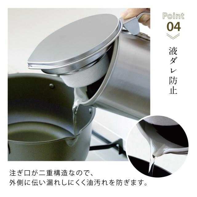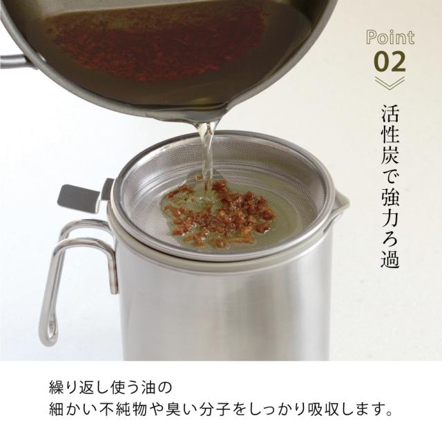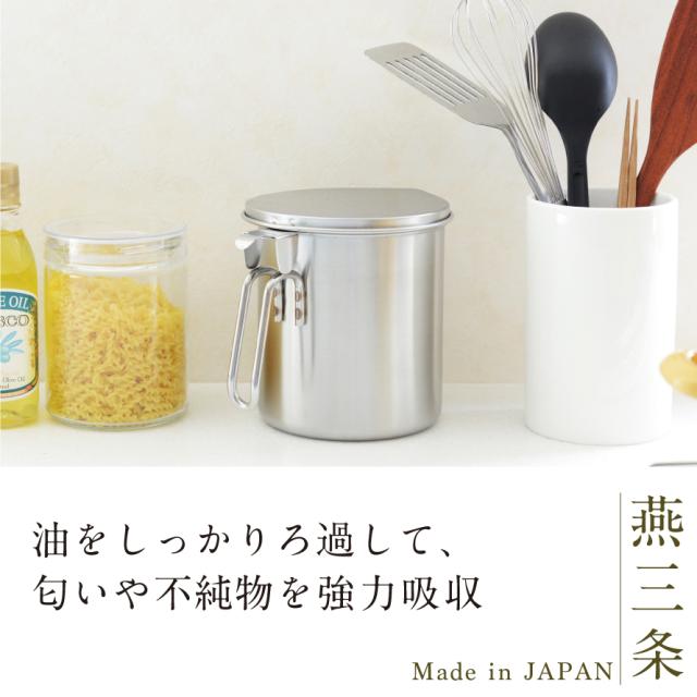 金属製品の産地新潟県「燕三条」で生産された高品質ステンレス製のオイルポット。活性炭カートリッジ式。不織布フィルターが網皿で取りきれない揚げカスなどをキャッチし、活性炭フィルターが細かい不純物や臭い分子を強力吸収します。