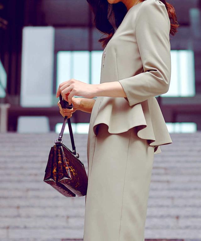 スーツに負けないきちんと感とエレガントさ。ペプラム付きIラインワンピース
