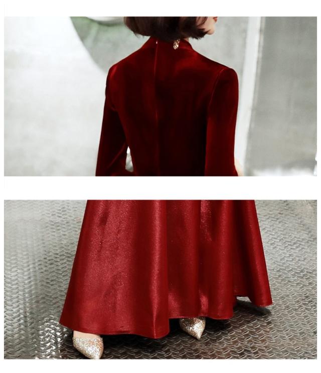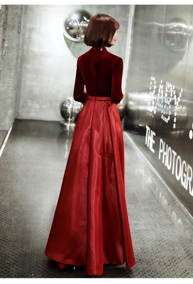 高級ベロア ロングドレス パーティードレス 舞台ドレス ナイトドレス ワンピ 黒 赤 長袖 二次会 発表会 大きい オーダーサイズ可能 D016