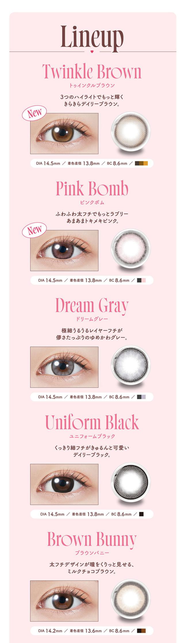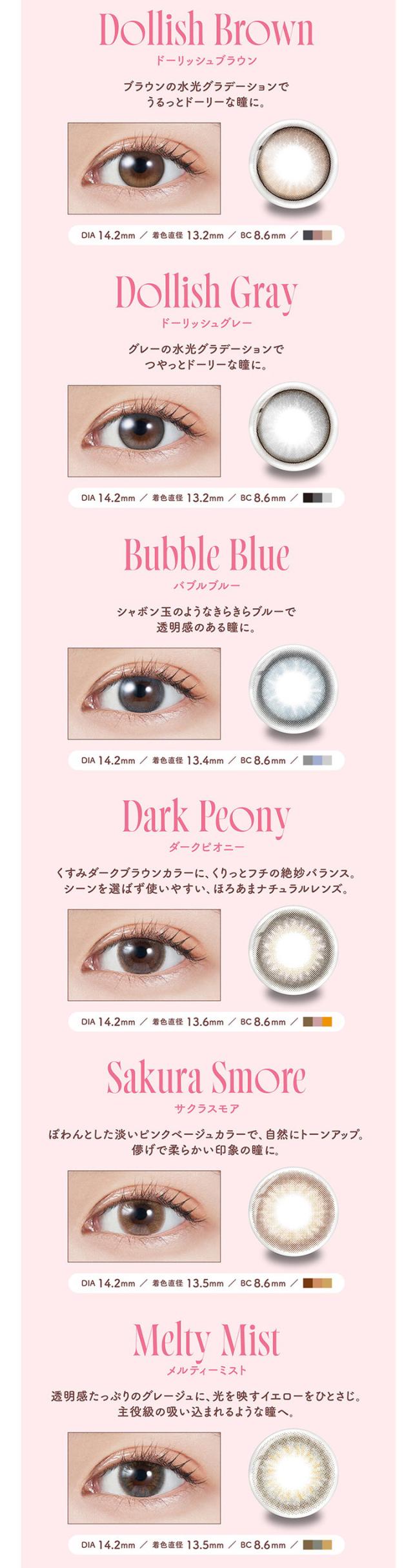 ■カラー:サクラペタル、ティントブラウン、サクラスモア、メルティーミスト、ダズルベージュ、ダズルグレー、コーラルブラウン、ミラーグレー、ダークピオニー、ドーリッシュブラウン、ドーリッシュグレー、バブルブルー、ブラウンバニー、ドリームグレー、ユニフォームブラック、トゥインクルブラウン、ピンクボム