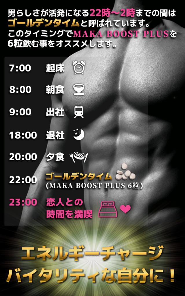 マカやクラチャイダム等、11種類の人気成分を贅沢に配合! 1日6粒で気力体力、疲れ気味なボディの悩みを解決!! 男の自信をアップさせます。パワーが欲しい女性にもオススメ!マカブーストアップ |