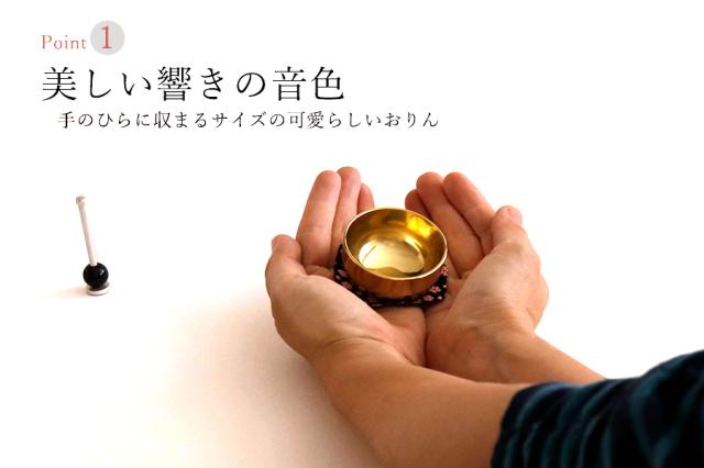小さなお仏壇や手元供養にオススメ。手のひらに収まるコンパクトサイズのおりんです。ミニサイズのおりんですが丁寧なつくりで、美しく澄んだ音色を響かせます。