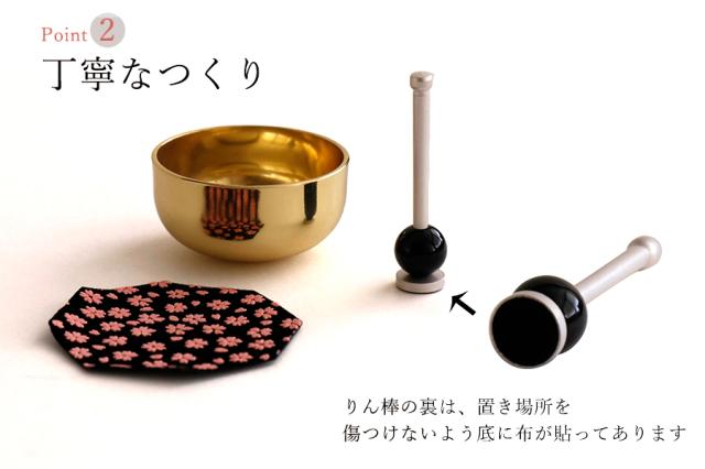 縁起の良い八角に、桜柄の小さくて可愛らしいおりん敷きと、専用のりん棒が付属。りん棒は自立式で、裏には置き場所を傷つけないよう底に布が貼ってあります。スタイリッシュな和の雰囲気のおりん3点セットを毎日のご供養に。