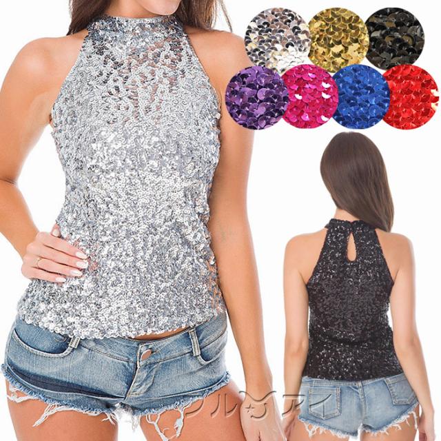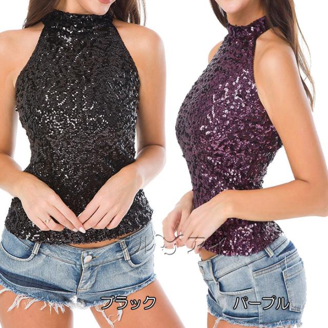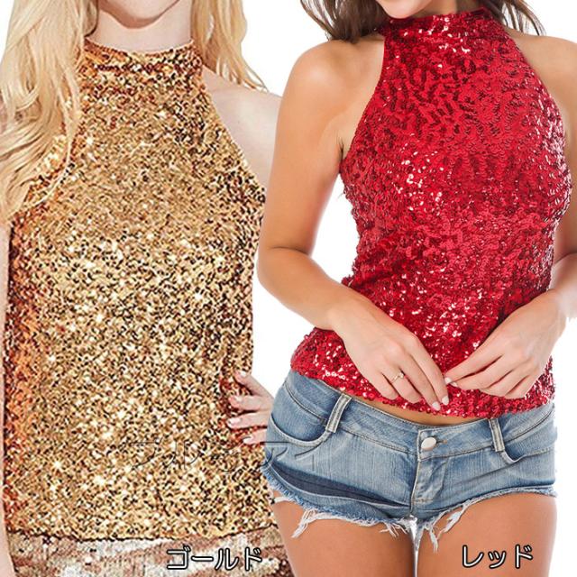 スパンコール ホルターネック アメリカンスリーブ ノースリーブ トップス
