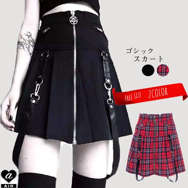 ゴシックスカート ブラック or レッド フリーサイズ 膝上 パンク サスペンダー カジュアル ボトムス コーデ イベント 衣装 コスチューム ゴスロリ お洒落 ミニ 足長効果 ゴスロリ ロック パンク 個性的 人気 ロリータ