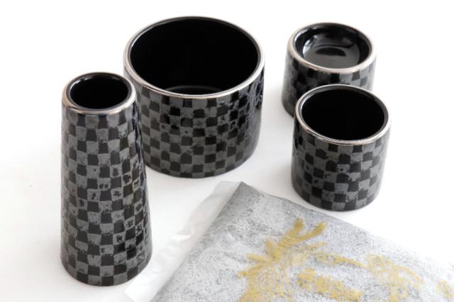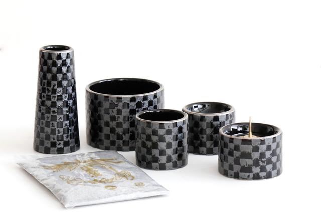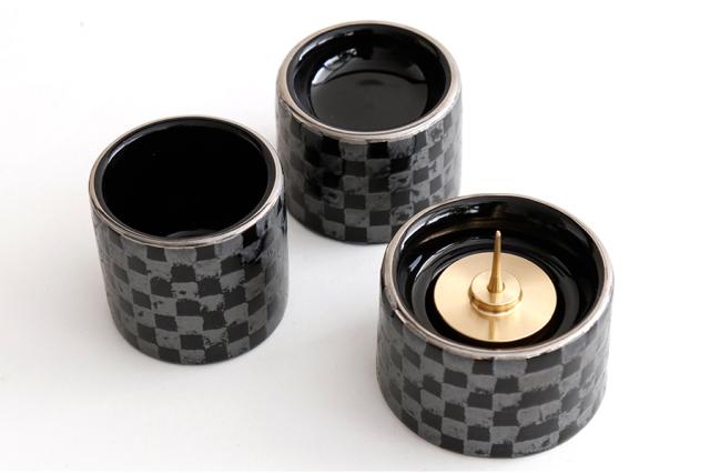 黒色の市松模様がお洒落でスタイリッシュな陶器製の仏具セットです。伝統ある仏壇やモダン仏壇、ミニ仏壇などにもぴったりの小ぶりなサイズ。渋いグレーに淵の銀色と黒の市松模様がかっこいい。高級感があり、どんな仏壇にも合わせやすくなじみます。