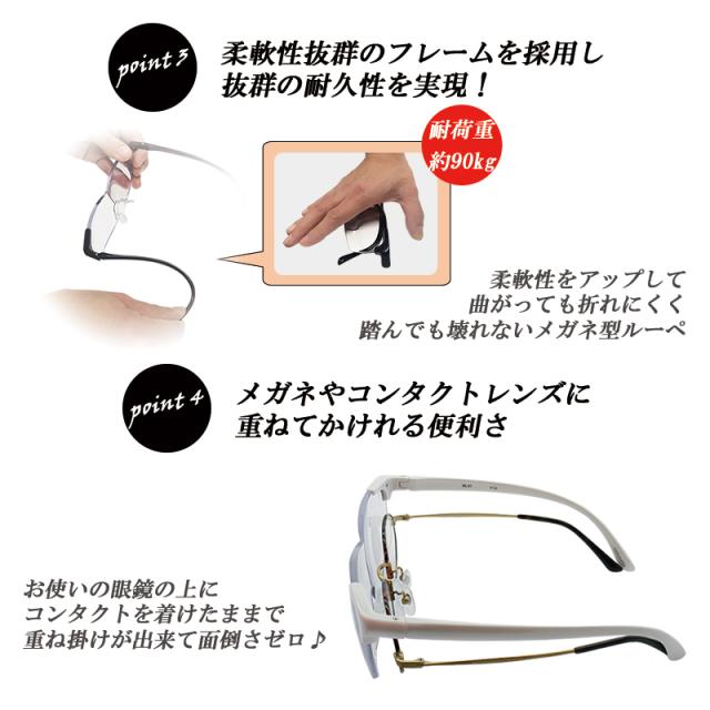 携帯に優れた軽量なフレームは、柔軟性抜群で壊れにくく、日常的に使用できるルーペグラスとなっています。