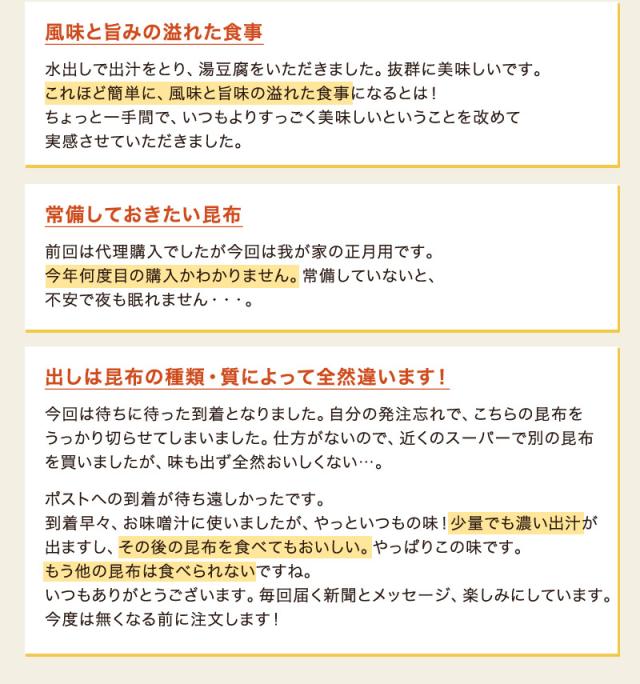 - お忙しい中 発送有難うございました!昨日受取させて頂きました!普段は 日?昆布を使用してるのですが、TVで お出汁をとるなら羅臼昆布!と プロが言ってたので、購入してみました。美味しいお出汁をつくりま...
