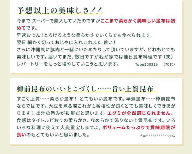 - すみません、いろいろ忙しくてレビューをすっかり忘れていました。 昆布(特に早煮昆布)が大好きで購入させていただきました。 次回もよろしくお願いいたします!