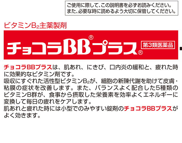 チョコラBBプラスは、肌あれ、にきび、口内炎の緩和と、疲れた時に効果的なビタミン剤です。