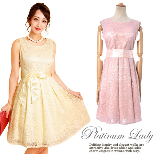 送料無料「沖縄、離島の方は除外です」ウエストサテンリボン付♪フラワーレース重ね光沢サテン地Aラインパーティーミディドレス
