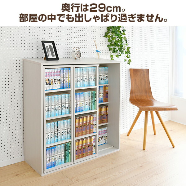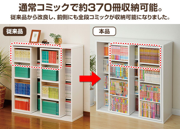 | 商品説明 | ●増えるマンガ本を出し入れしやすく大量収納 ●縦に重ねても、横に並べてもOK、お部屋の広さに合わせて使い方いろいろ ●収納目安:コミック370冊、文庫本370冊 ●省スペースに大容量収納 ●前側収納はスライド式なので、後側の本も取り出しラクラク ●全段にコミック本が無駄なく収納可能 ●棚板の高さは、収納する物に合わせて、前後の棚どちらも調整可能 ●前側棚板6枚:幅25 奥行12.5cm、約3cm間隔で高さ調整可能 ●前側収納部内寸:幅25 奥行12.5 高さ83.5cm ●後側棚板6枚:幅42 奥行12.5cm、約3cm間隔で高さ調整可能 ●後側収納部内寸:幅42 奥行12.5 高さ88.5cm ●耐荷重:可動棚(前)4、可動棚(後)6、天板 10kg ●背面化粧なし ※プラスドライバーをご用意ください。 ※2018年6月11日より、全段通常コミックが入るサイズへリニューアルして販売となります。 ※2023年12月21日より、ライトブラン廃盤、ダークブラウン追加となります。 |