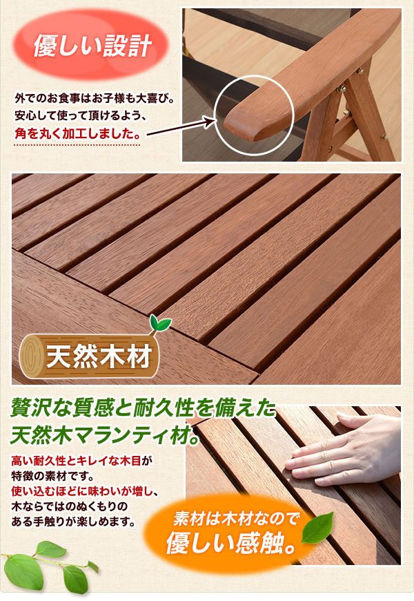 | 材質 | 本体:天然木マランティ材(オイルステイン仕上) チェア張地:ポリエステル(塩化ビニール樹脂コーティング) |