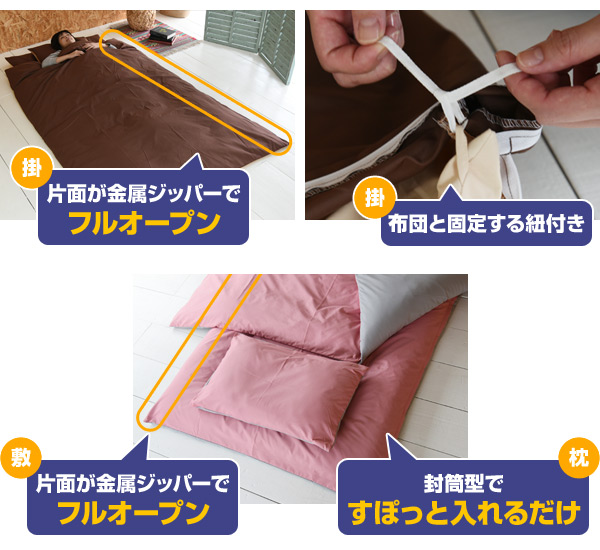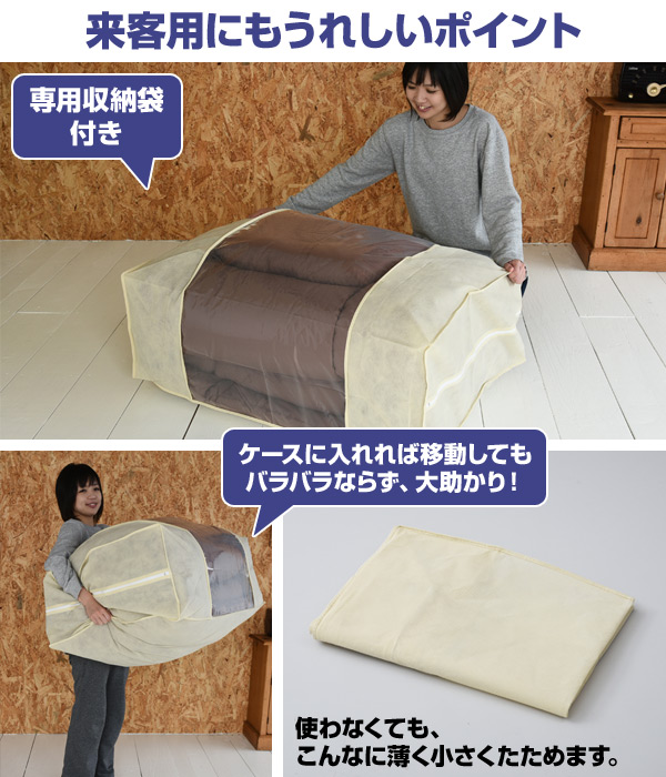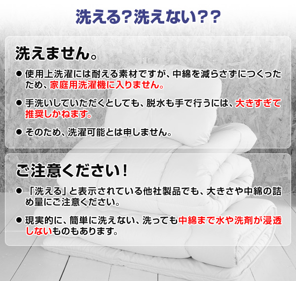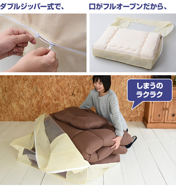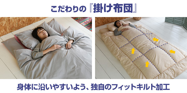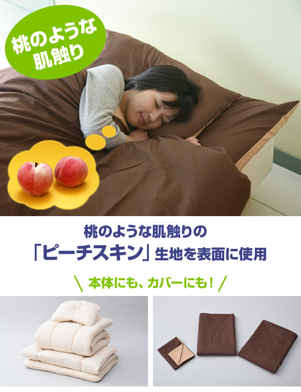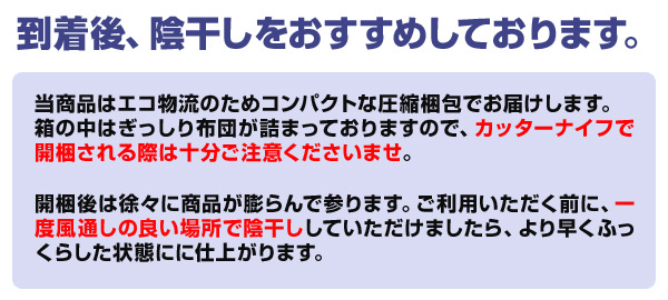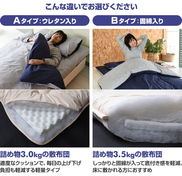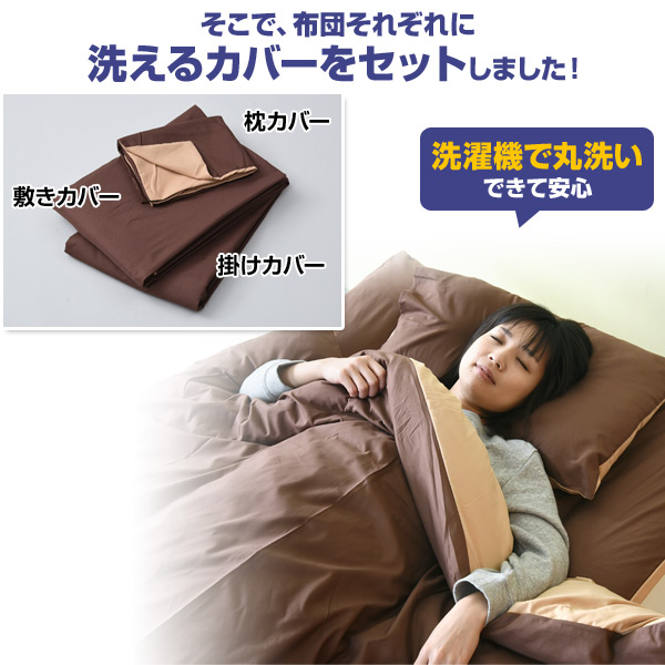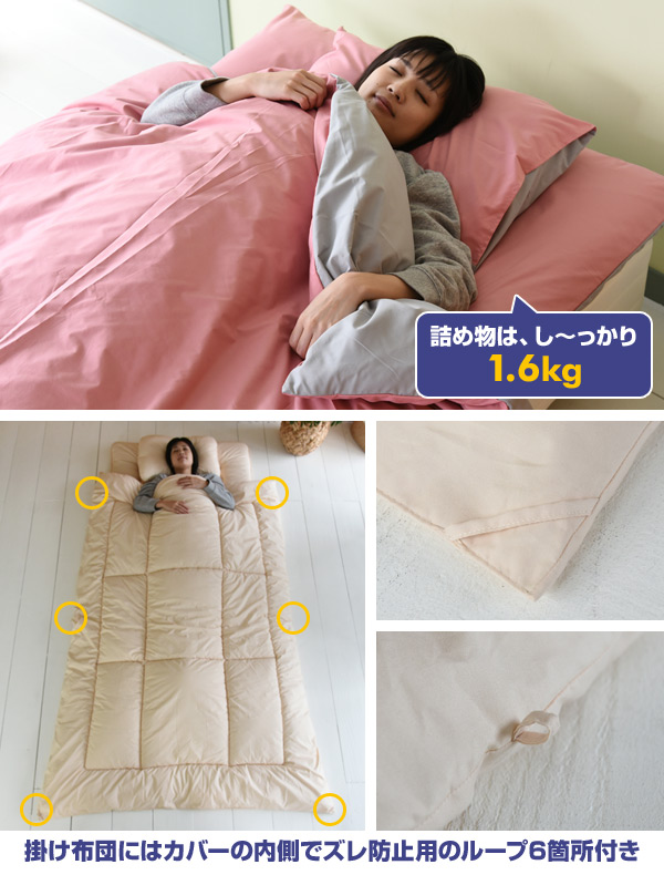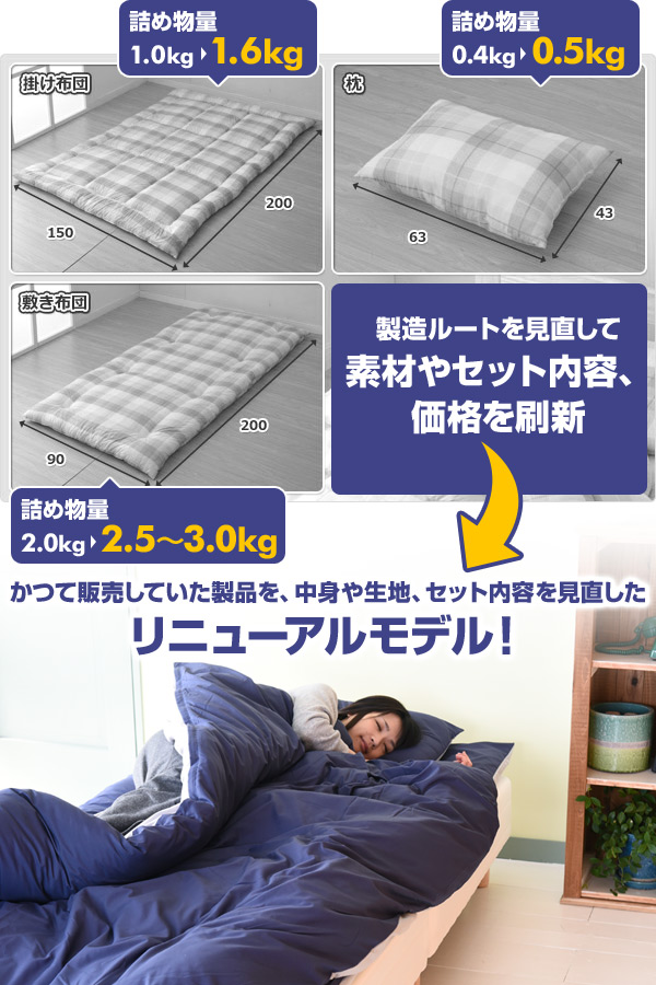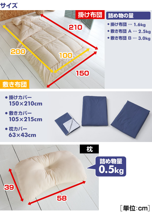 | 本体サイズ | 【掛け布団】 150×210cm 重量2.6kg 【敷き布団】 100×200cm 重量(A)3.0/ (B)3.5kg 【枕】 58×39cm 重量0.6kg 【掛けカバー】 150×210cm 【敷きカバー】 105×215cm 【枕カバー】 63×43cm 【収納袋】 100×67×35cm 重量0.3kg |