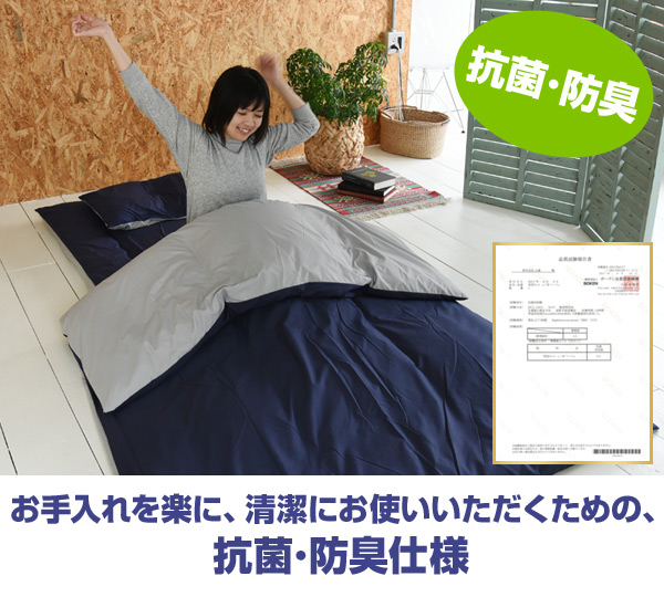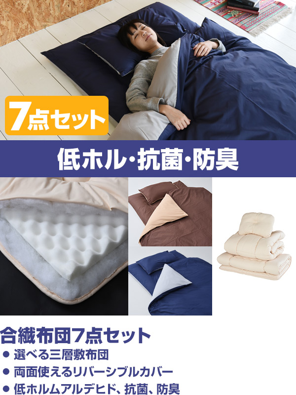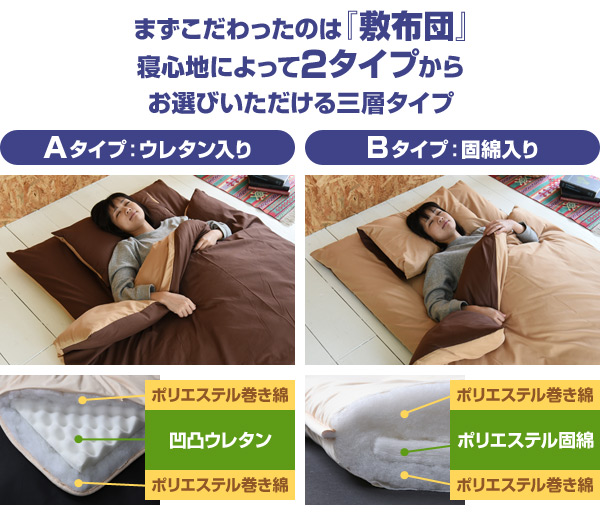 | 材質 | 【掛け布団】 詰め物:ポリエステル100%、1.6kg 側地:ポリエステル100% 【敷き布団 A】 詰め物:巻綿 ポリエステル100%、1.5kg、ウレタンフォーム、1.0kg 側地:ポリエステル100% 【敷き布団 B】 詰め物:巻綿 ポリエステル100%、1.5kg、固綿 ポリエステル100%、1.5kg 側地:ポリエステル100% 【枕】 詰め物:ポリエステル100%、0.5kg 側地:ポリエステル100% 【カバー(共通)】 側地:ポリエステル100% 【収納ケース】 不織布・塩化ビニル樹脂 |