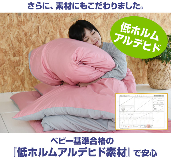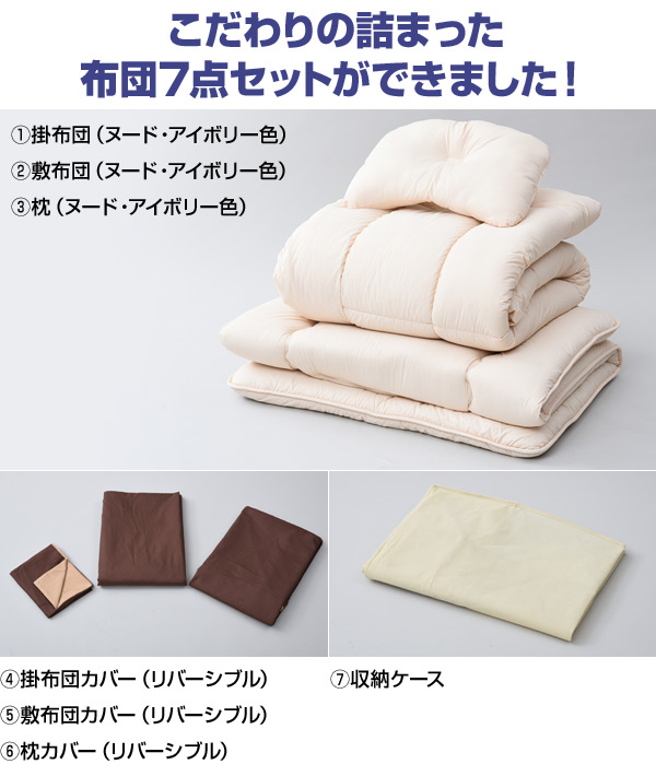 | 商品説明 | ●シンプルな無地リバーシブルカバー付きの布団7点セット ●こだわりの敷布団は2つの仕様から選択可能:【Aタイプ】適度なクッションの凹凸ウレタン入りタイプと、【Bタイプ】しっかりとした1.5kgの固綿入りタイプ ●【セット内容】掛け布団、敷き布団、枕、掛布団カバー、敷布団カバー、枕カバー、収納ケース ●敷布団Aタイプ:軽いのに適度なクッション性、凹凸ウレタンフォームが中に入ったモデル ●敷布団Bタイプ:固綿+巻き綿で合計3.0kgのしっかりタイプ ●掛布団は身体に沿いやすいよう、独自のフィットキルト加工 ●こだわりの枕は、フィットする中央部くぼみ&寝返りサポートする首元アーチ形状 ●付属のカバーリングは表裏で両面使えるリバーシブル仕様 ●洗濯機で丸洗い可能なカバー、掛け敷きはジッパータイプ、枕は筒状タイプ ●布団や枕本体は、アイボリー系の無地タイプ ●ベビー基準で合格の安心低ホルムアルデヒド ●お手入れを楽に、より清潔にお使いいただくための、抗菌防臭仕様 ●桃のような肌触りの「ピーチスキン」生地を表面に使用 ●掛け布団にはカバーの内側でズレ防止用のループ6箇所付き ●保管用の収納ケースは、すっぽり収まるサイジング ●掛布団、敷布団:手洗い、クリーニング=OK(枕は不可)※第三者試験機関調査結果より ※2017年8月1日より2015年まで販売していた製品を、詰め物の量や生地を見直したリニューアル販売となります。 |