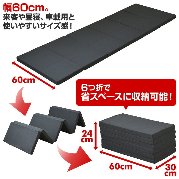 | 商品説明 | ●60×180cm のごろ寝サイズ ●お子さまの昼寝用、アウトドア、車中泊などで活躍使わない時は超コンパクトにたためる6つ折りタイプ ●全面かためのウレタンフォームを使用 ●薄くても体をしっかり支える高硬度タイプ ●ウレタン密度:60kg/m3 ●折りたたみ時サイズ:厚み24 幅60 長さ30cm ●側地は中国製※開封時にウレタンフォームの臭いがこもっている場合がございますが、換気により緩和されます。 ●ニュートン数: 265N(A法) ※2023年9月より、グレー色、ネイビー色追加致します。 |