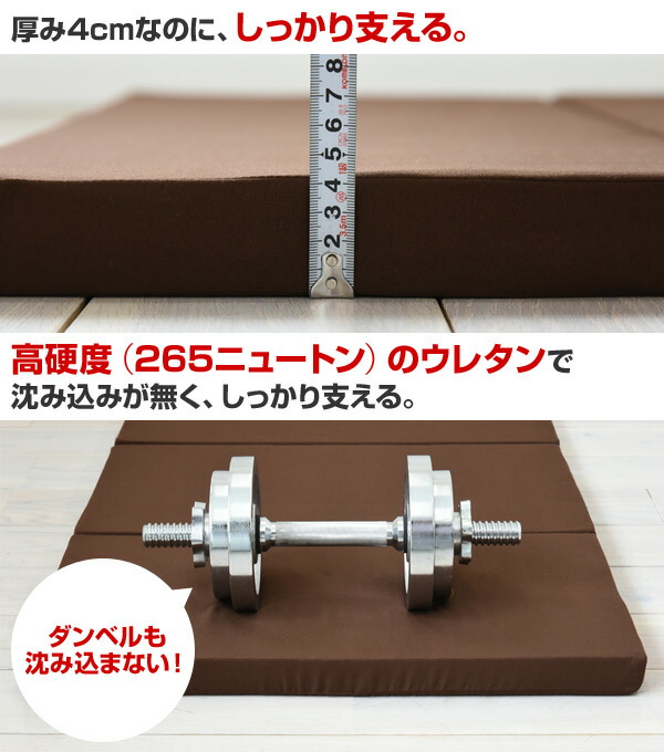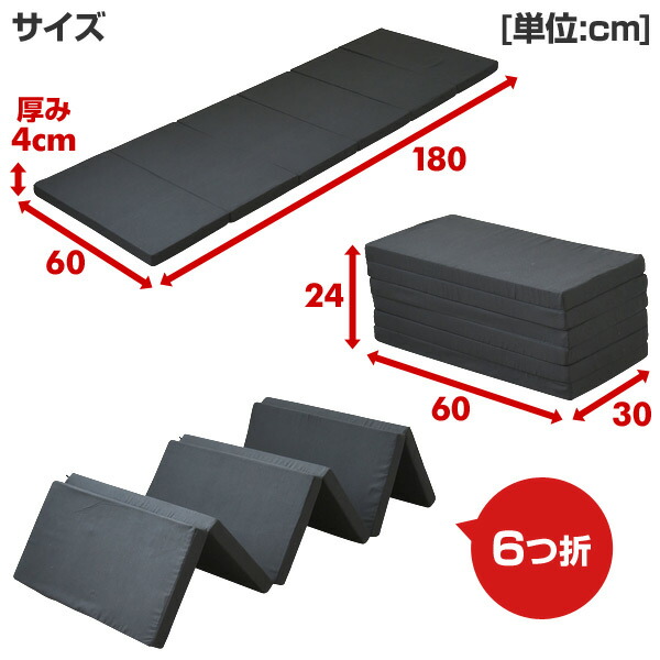 - 車中泊用に買いました。 ベッドのマットにはちょっと硬すぎるかもだけど、敷きっぱなしで上に荷物を置いてもヘタらないので使い易い。 6つ折りなので、椅子がわりにする際も高さを適当に変え易く、収納の際の社内のスペース確保もしやすい。 カバーを取り外し出来る点もGoodです。 寝る際は、硬さの好みに応じて一枚下に敷く方が良いかも?