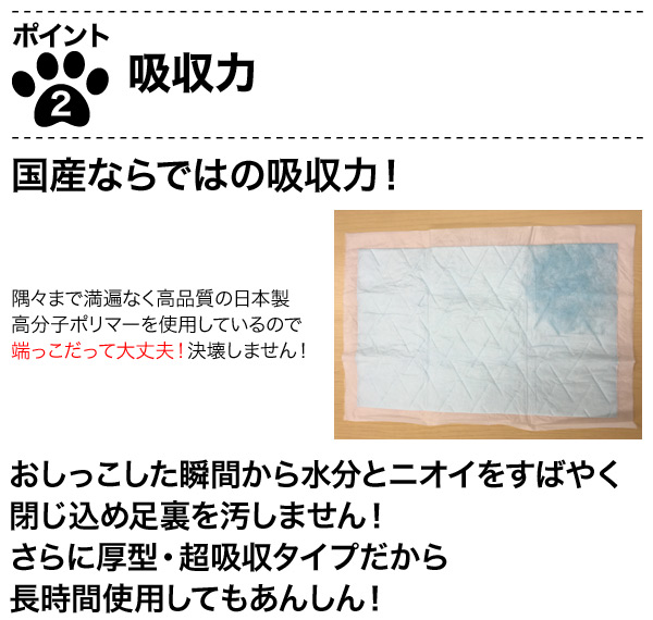 | 商品説明 | ●高品質!日本製ペットシーツ ●表面はブルー、裏面は白色だから裏表が分かりやすい ●端っこまで国産高分子ポリマーびっしりだからモレずに安心 ●おしっこした瞬間から水分とニオイをすばやく閉じ込め足裏を汚しません ●厚型・超吸収タイプで長時間使用しても安心! ●留守の多いわんちゃんにオススメです |