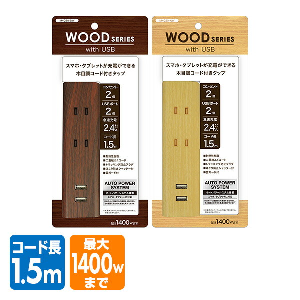 スマホ・タブレット充電ができる木目調コード付きタップ 1.5m コンセント2口 USBポート2口 急速充電2.4A 合計1400Wまで M4020-DW 電源 たこ足 タコ足 2口タップ 2個口タップ トップランド TOPLAND 【送料無料】