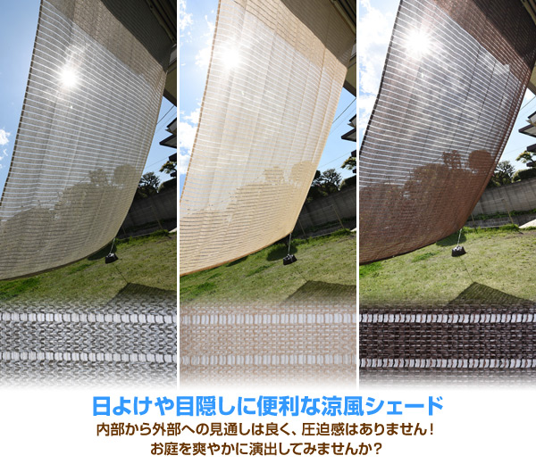 | 商品説明 | ●お得な同色2枚セット ●カラーは3種類(グレー、アイボリー、ブラウン)よりお選びください ●日よけや目隠しに便利なガーデンシェード ●直射日光をやさしく和らげます ●室内の温度上昇を緩和し節電効果も ●取付ロープ3m×2本入り ●ハトメ8箇所付き ●UVカット率:70% ●水洗い可能 ※風の強い日は使用せず取り外してください ●通気性約2倍(当社比) |