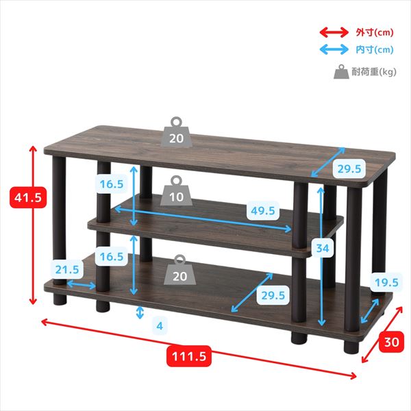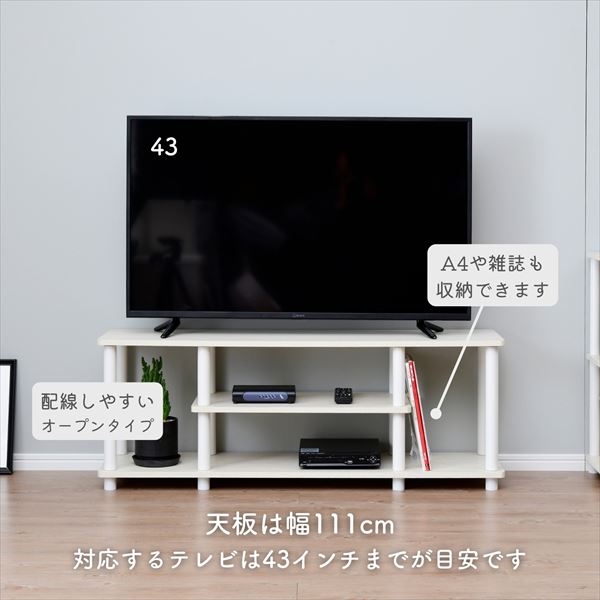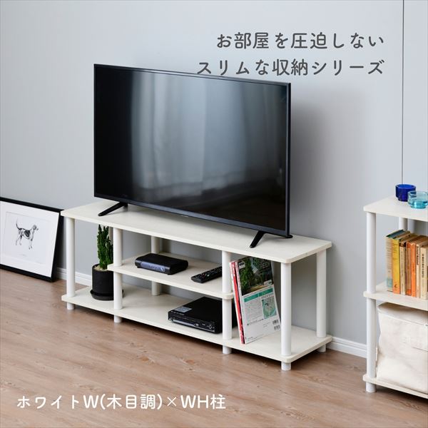 | 商品説明 | ●奥行き30cm、スリムでお部屋を圧迫しないオープンタイプのテレビ台 ●工具不要で、ポールをねじって棚板をとめるだけのかんたん組み立て式 ●対応テレビ目安:43インチまで ●デッキもA4サイズまでの雑誌も、まとめて収納可能 ●天板サイズ:幅111.5 奥行29.5cm ●中棚板サイズ:幅60 奥行29.5cm ●中段・下段ポール間内寸:幅49.5 奥行19.5 高さ16.5cm ●底板下すき間:4cm ●耐荷重:天板約20kg、中段約10kg、下段約20kg ※2022年5月9日より、カラーラインナップを見直しての販売となります。 |