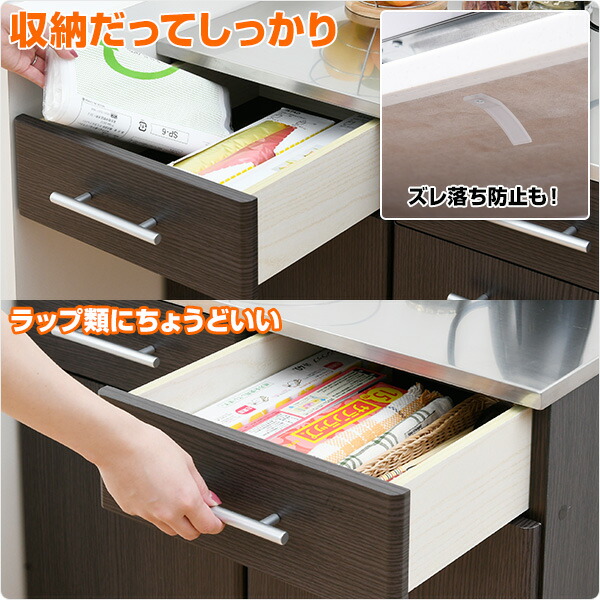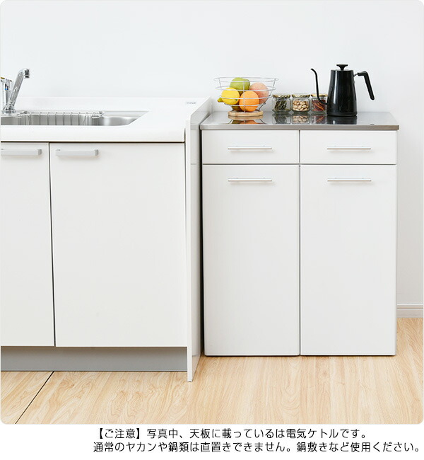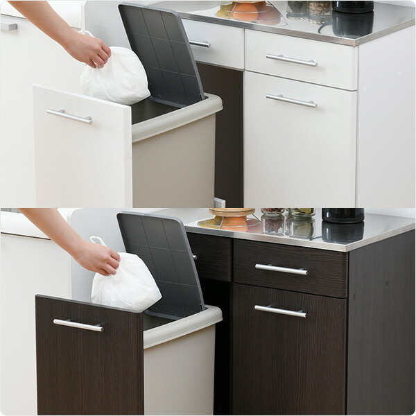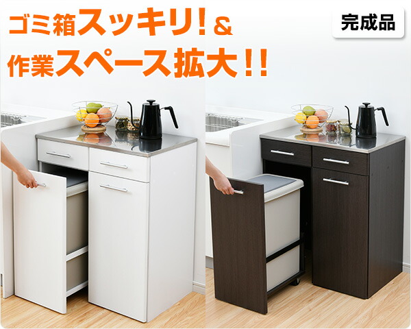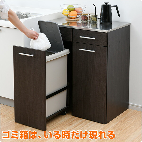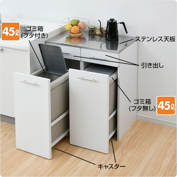 | 商品説明 | ●収納や作業台と一体になった、隠せるダストボックス ●天板は水や熱に強いステンレス仕様、作業台としても大活躍 ●大型45リットルのダストボックス付属、ワンプッシュ式のフタ付き ●キャスター付きで前後に出し入れ ●天板下に浅引き出し付き、カトラリーやラップ、ゴミ袋など細かいモノを収納 ●耐荷重=天板:20kg、引き出し:1杯あたり4kg、ペール:5kg /u/51537942/c/49476 ●引出内寸:幅28.5 奥行37 深さ10cm ●背面化粧あり ●本体は完成品でのお届け 【ご注意ください】写真中、天板に載っているは電気ケトルです。 通常のヤカンや鍋類は直置きできません。鍋敷きなど使用ください。 |