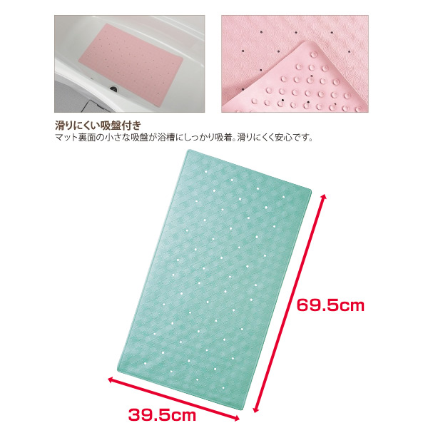 | 商品説明 | ●浴室内での転倒防止に大活躍 ●滑りにくい吸盤付き ●マット裏面の小さな吸盤がよくそうに浴槽にしっかり吸着 ●浴槽内にも使えます ※一部浴槽に吸盤が吸着しにくい浴槽もございます、一度水を入れる前に確かめてからご使用下さい |