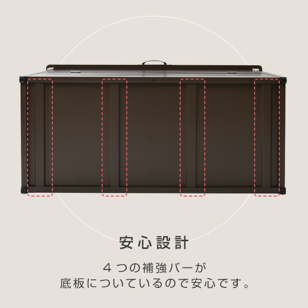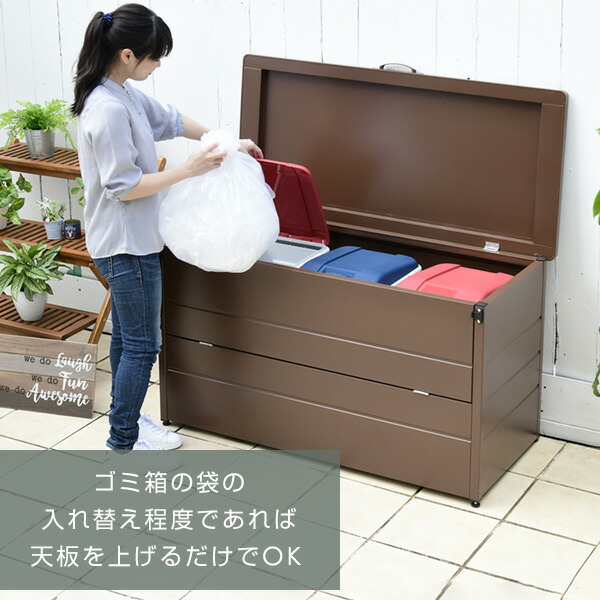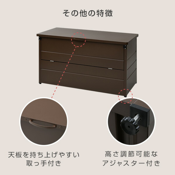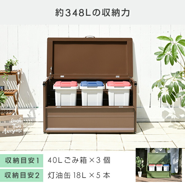 | 商品説明 | ●物の出し入れがしやすい屋外用ダストストッカー ●選べる3色(ダークブラウン、カーキ、ネイビー) ●容量:約348L 収納目安1:40Lごみ箱×3個 収納目安2:灯油缶18L×5本 ●内寸:幅113×奥行49×高さ63cm ●ハイテンション亜鉛メッキ鋼板で硬度が高く、さびに強い ●地面との接地部は高さ調節可能なアジャスター付き ●カラス対策や臭い対策にも最適 ※ゴミ箱は付属しておりません ※2021年1月6日販売分より以下の点をリニューアルしました ・カラーが3色に変更になりました |